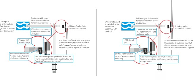 L'hélice de cette éolienne a besoin d'un flux d'air soutenu pour tourner. Mieux vaut donc attendre un moment venteux pour expérimenter son fonctionnement. En revanche, en cas de tempête, il est conseillé de la mettre à l'abri car elle pourrait se casser.